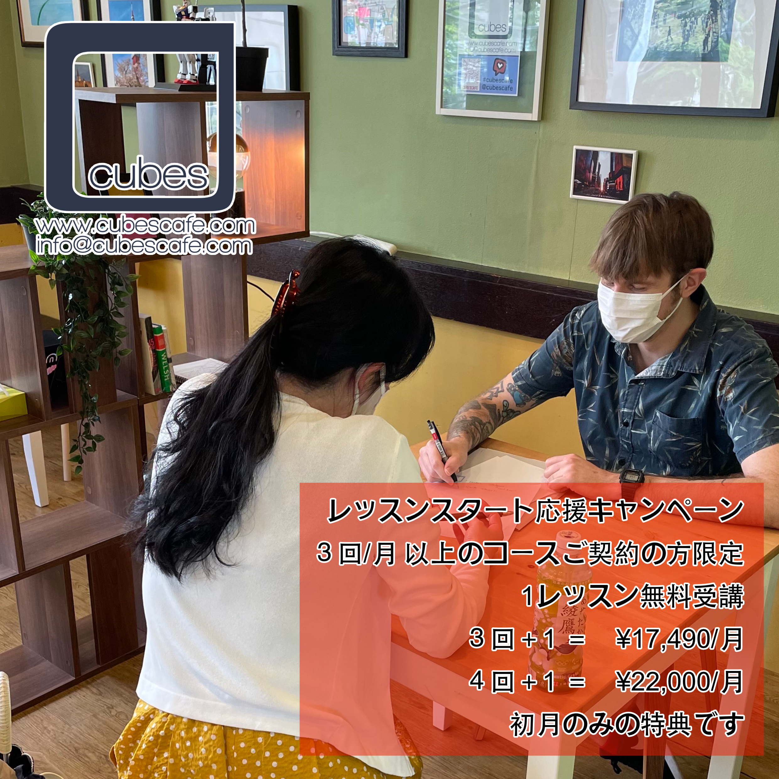 2021.8.8 レッスンスタート 応援キャンペーン レッスンスタート応援キャンペーン 3回/月 以上のコースご契約の方限定 1レッスン無料受講 3回+1 = ¥17,490/月 4回+1 = ¥22,000/月 初月のみの特典です ~9/30まで